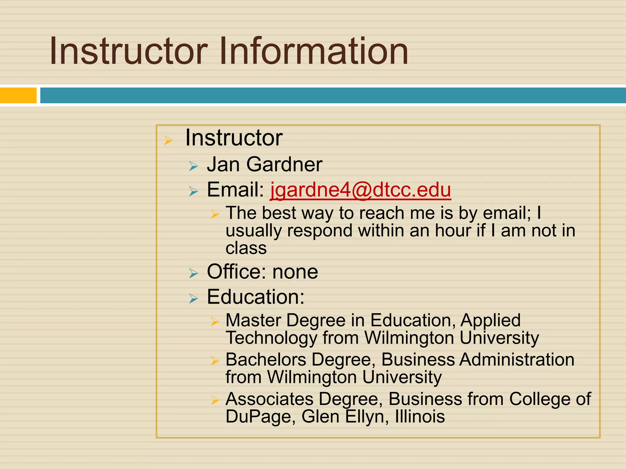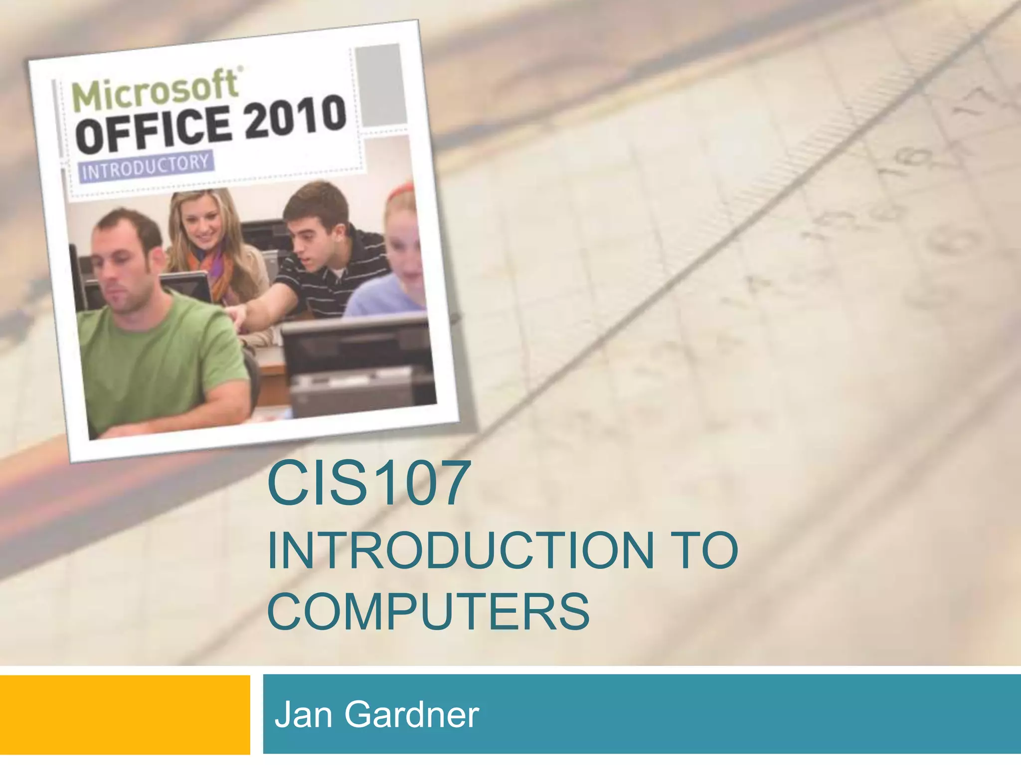 This document provides information about the CIS107 Introduction to Computers course. It outlines that the instructor is Jan Gardner, the class will meet Tuesday/Thursday or Tuesday evenings from August to December, and required materials include a textbook, Office 2010 software, USB drive. It details the coursework including tutorials, assignments, quizzes on Word, PowerPoint, Excel and Access chapters. Grades are calculated based on skills assessments, tutorials, quizzes and assignments. The course goals are also summarized.