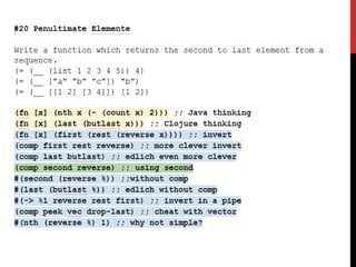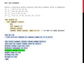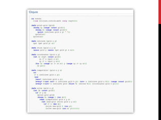 The document discusses the programming language Clojure, highlighting its functional and dynamic features, as well as its performance and ease of use on the JVM. It contrasts Clojure with other languages, emphasizing its abstract code structure and concurrency capabilities, while addressing some drawbacks like debugging challenges and complexity with namespaces. Quotes from industry experts express the joy and craftability of coding in Clojure compared to traditional languages like Java.