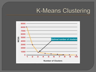 Clustering is an unsupervised machine learning technique that groups unlabeled data points into clusters based on similarities. It can be used for tasks like market segmentation, image segmentation, and anomaly detection. The k-means clustering algorithm is a common partitioning clustering method that divides data into k predefined clusters by minimizing distances between data points and cluster centroids.