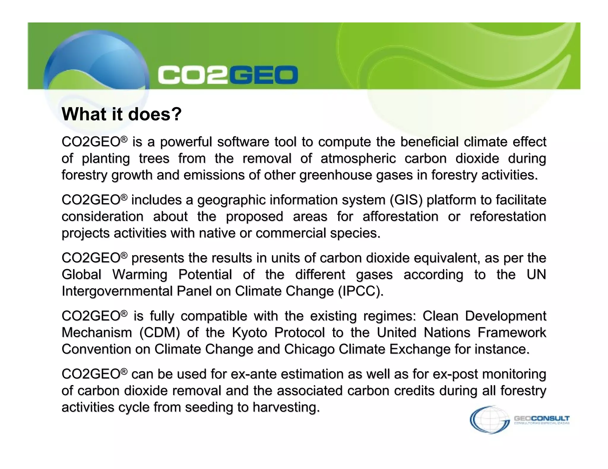 CO2GEO® is software that calculates the climate impact of planting trees by estimating the removal of carbon dioxide from the atmosphere through tree growth and emissions of other greenhouse gases from forestry activities. It uses geographic information systems and models approved by the UNFCCC to estimate carbon credits from afforestation/reforestation projects. Geoconsult offers consulting services using CO2GEO® to support the development of CDM forestry projects and monitoring of carbon removal and credits.