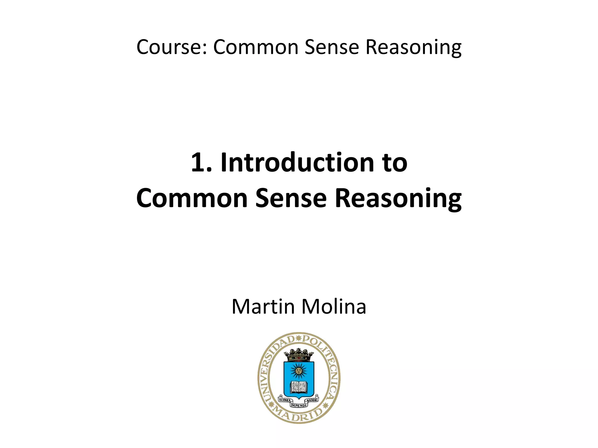 This document provides an introduction to common sense reasoning in artificial intelligence. It discusses how common sense knowledge is important for machines to perform everyday tasks and simplify communication with humans. The document outlines some of the challenges with common sense reasoning, including how to simulate human reasoning, build vast knowledge bases, and formalize commonsense knowledge from multiple domains using different representation methods. It also provides examples of progress in theoretical approaches, knowledge bases, semantic technologies, and applications of common sense reasoning.