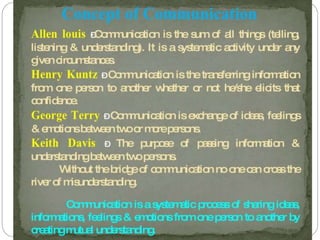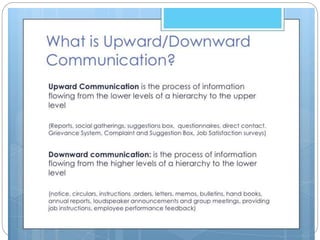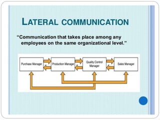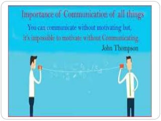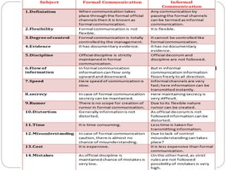 - Communication is important for exchanging information, providing feedback, influencing others, and achieving organizational goals. It can be formal, following defined channels, or informal through casual discussions.