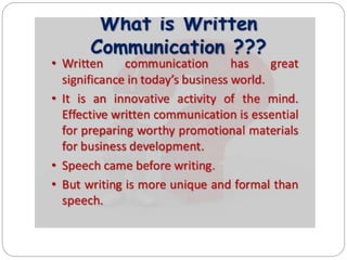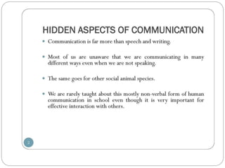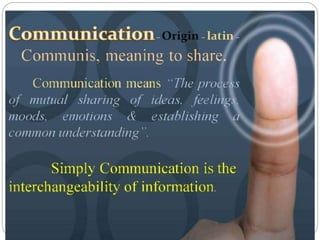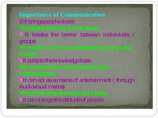 This document provides an introduction to communication, including its definition, aspects, importance, forms, and types. Some key points: