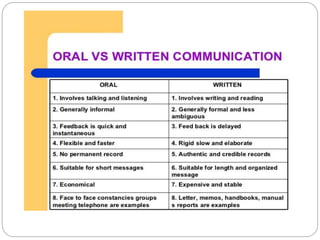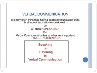 - There are various aspects and forms of communication, including verbal (oral and written) and non-verbal communication. Effective communication relies on both verbal and non-verbal elements.