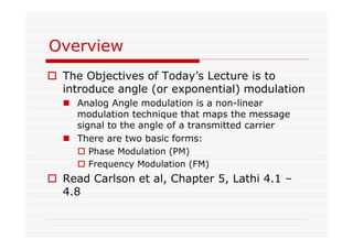 This document discusses an EEE 330 lecture on angle modulation and demodulation. It introduces phase modulation (PM) and frequency modulation (FM), the two main forms of analog angle modulation. PM varies the phase of the carrier linearly with the message signal, while FM varies the frequency of the carrier linearly. The document compares and contrasts PM and FM through examples and discusses narrowband FM, wideband FM, generation and demodulation of FM signals, and practical FM demodulators like the frequency discriminator and phased-locked loop.