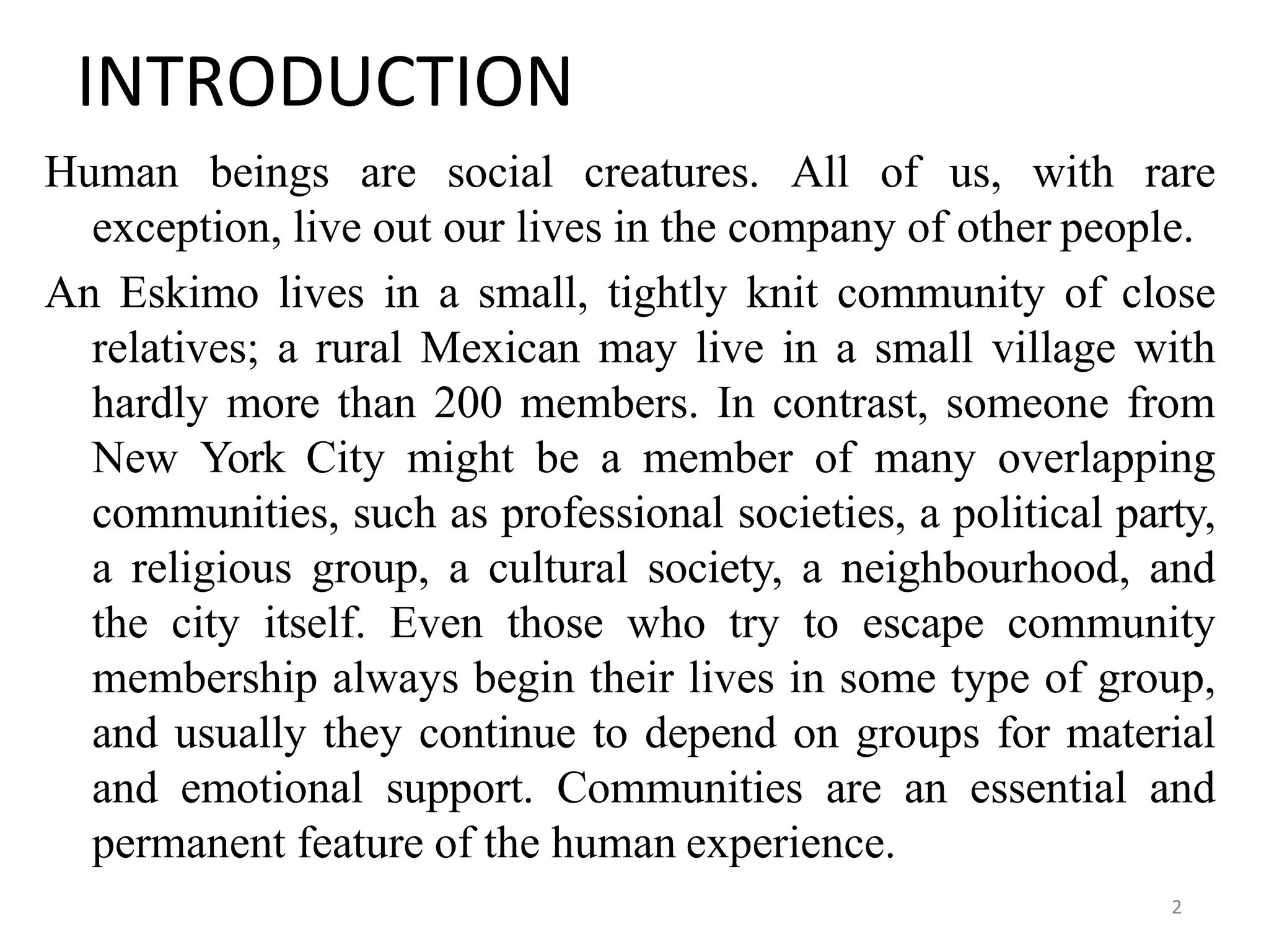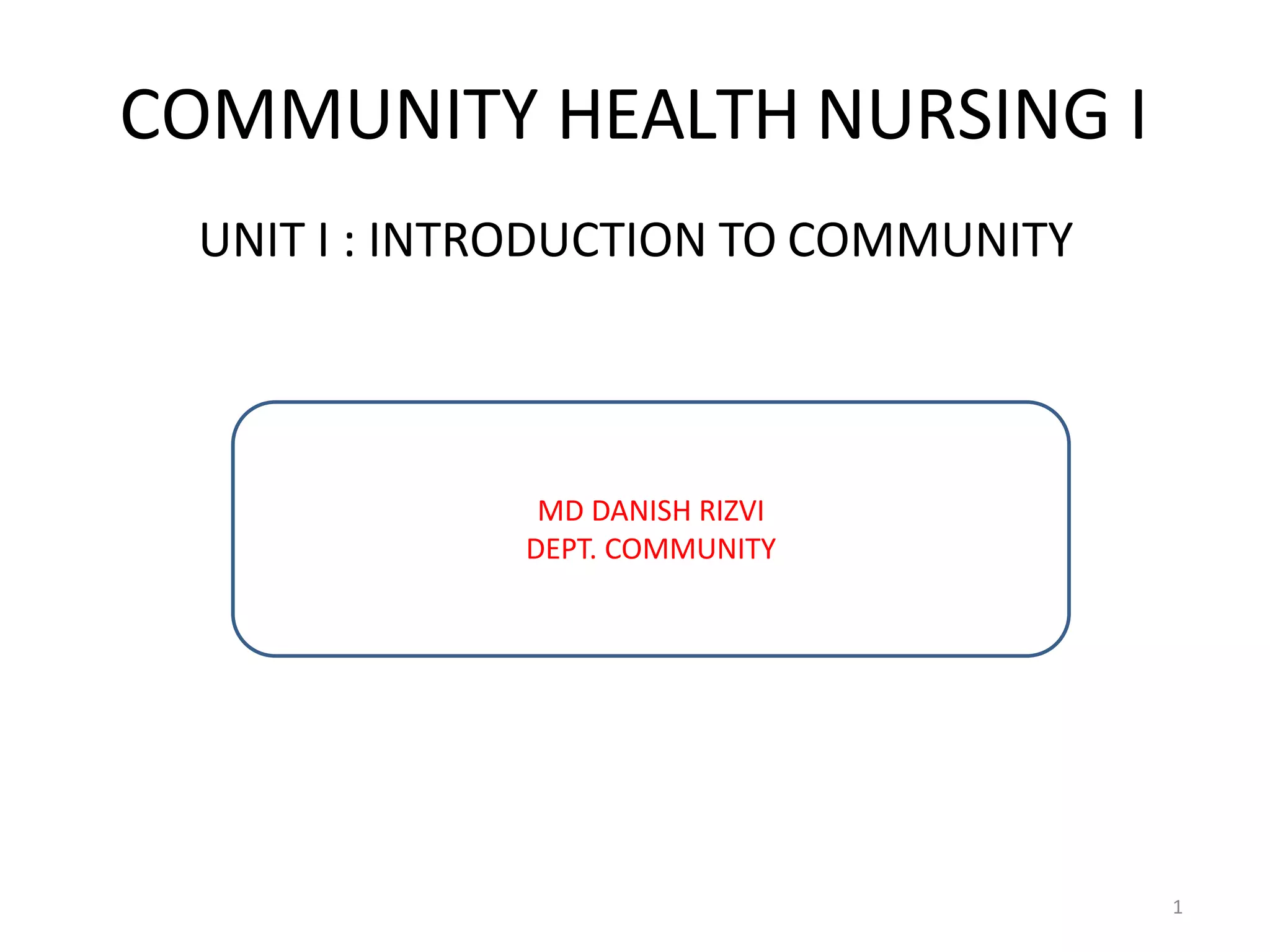 This document provides an introduction to community health nursing. It defines key terms like community, community health, public health, and the differences between urban and rural communities. It discusses the historical development of community health nursing from ancient civilizations to the modern era. It outlines the objectives, roles, and functions of community health nurses, which include providing care, educating communities, managing resources, conducting research, and advocating for community needs. The nursing process is applied to the role of community nurses in home visits to assess needs, plan interventions, implement plans, and evaluate outcomes.