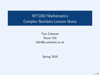 The document is a set of lecture notes on complex numbers, outlining their definition, arithmetic operations, properties, and geometric representation in the complex plane. It discusses complex conjugates, modulus, and argument as well as their applications in equations and geometry. Key concepts include addition, subtraction, multiplication, and division of complex numbers, along with transformations to polar form and the relationship between these forms.