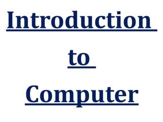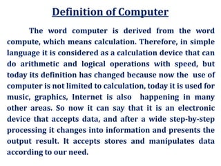 A computer is an electronic device originally designed for calculations but now widely used for various applications, including music, graphics, and the internet. It consists of hardware and software components, performs tasks with high speed and accuracy, and has become essential in fields like business, science, healthcare, and education. Computers can be categorized by size and data handling capabilities, including personal computers, supercomputers, and analog, digital, and hybrid computers.
