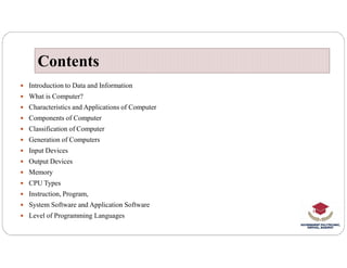 This document provides an introduction to computers, including definitions of key concepts like data, information, and computer components. It discusses how computers accept data as input, process it, and provide output. The main components of a computer are described as the input and output devices, CPU (which has the ALU, memory, and control unit), and storage. Computers are classified based on their functionality in handling analog vs. digital data or their purpose as general purpose or special purpose machines. They are also classified by speed and size, with supercomputers being the largest and fastest.