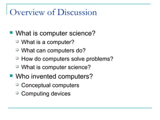 This document provides an introduction to computer science, including definitions of key terms like computer, algorithm, and computer science. It discusses how computers solve problems by taking an algorithmic approach, breaking problems down into step-by-step instructions. The history of computer science is explored, from early conceptual computers in mathematics to the first electronic computers engineered in the 1940s. Programming languages and approaches like structured programming and object-oriented programming are also introduced.