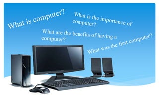 The document details a 10-day training workshop hosted by resource speaker Mark John Perez, focusing on the essentials of technology, including hardware, software, and networking. It outlines the objectives and history of computers, the classification of computer types, and the fundamental components of computer systems. Additionally, it provides insights into computer peripherals, internal components, and the relationship between hardware and software.
