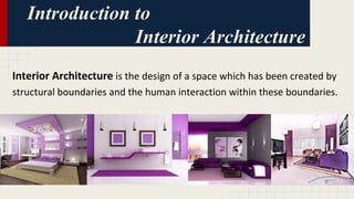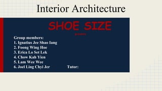This document discusses interior architecture and design. It introduces the group members and tutor for the "SHOE SIZE" presentation. It then defines interior architecture as the design of spaces defined by structural boundaries and human interaction within them. It outlines the role of interior architects in designing interior spaces to meet user needs, functionality, and client expectations. Finally, it describes the key stages of interior design projects: design brief, initial sketches, design concept, design development, and final product.