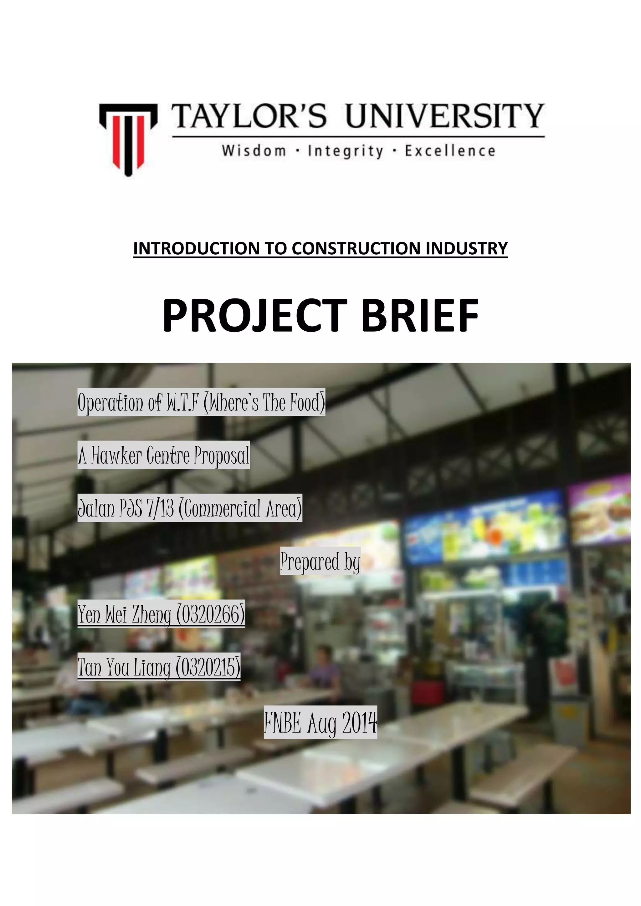 This document provides a project brief for a proposed hawker centre called W.T.F. located in a commercial area in Jalan PJS 7/13. The proposal includes an introduction to the project, concept, site analysis, specifications, zoning plans, costing details, and conclusion. The hawker centre aims to provide food and dining options for local residents and students, as there is currently a lack of restaurants in the area. It will be a two-story building with stalls on the ground floor and a dim sum restaurant on the first floor. Benefits include convenience for neighbors and students, while disadvantages include potential noise and pollution from the nearby road. Total estimated cost is RM592,100.