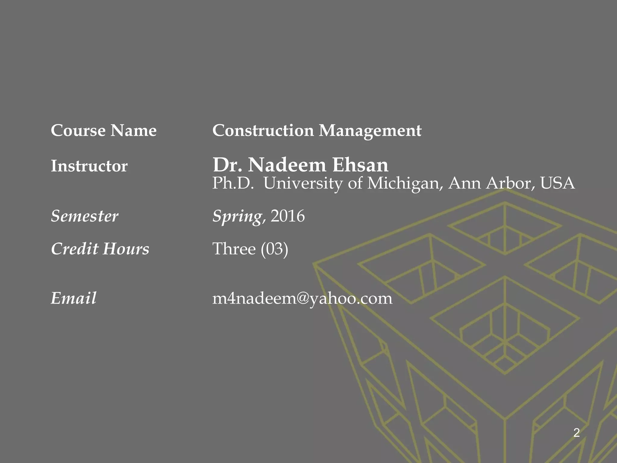 The document outlines the Construction Management course taught by Dr. Nadeem Ehsan at the University of Michigan, highlighting his qualifications and extensive project management experience. It details the course structure, including weekly topics, grading criteria, and the importance of professional ethics and attendance for student success. Additionally, it discusses the construction industry's context in Pakistan, including its challenges, demand forecasts, and the role of various participants in the construction process.
