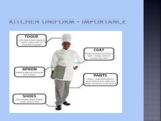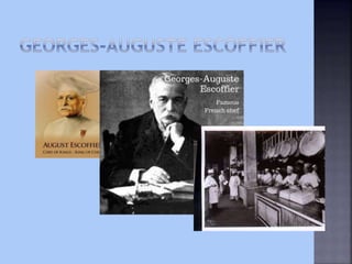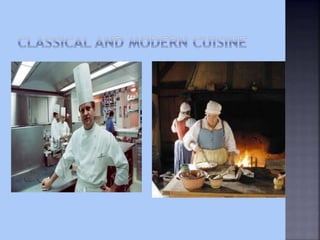 The document discusses the history and evolution of modern food service and cooking techniques. It notes that while quantity cookery has existed for thousands of years, modern food service is traced back to the 18th century in France. Georges-Auguste Escoffier is described as revolutionizing cooking in the early 20th century through simplifying techniques and reorganizing kitchens. The document also discusses how advances in technology, globalization, and consumer preferences have continued to change cooking styles and menus over time.