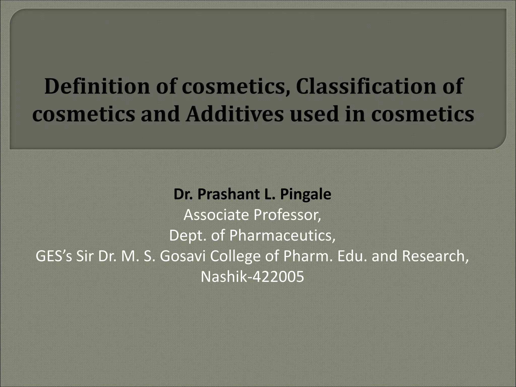 This document discusses cosmetics and provides information on various topics related to cosmetics including: