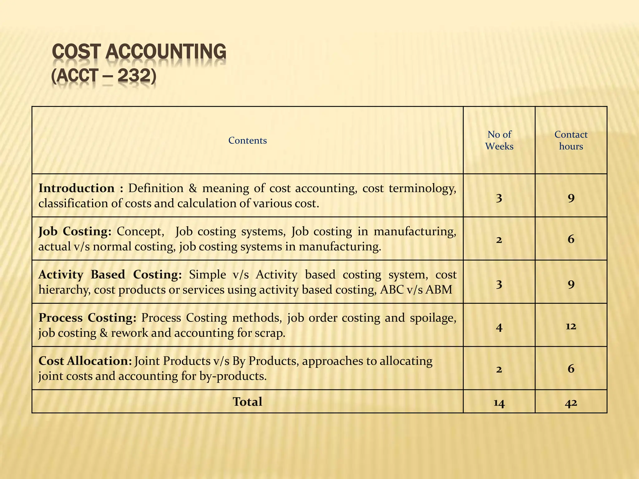 This document outlines the course contents and schedule for a Cost Accounting course. The course covers topics like introduction to cost accounting, job costing, activity based costing, process costing, and cost allocation. It is divided into 14 weeks and covers these topics through lectures, assignments, quizzes and model papers. Detailed information about the contents covered in each unit and evaluation methods are provided.