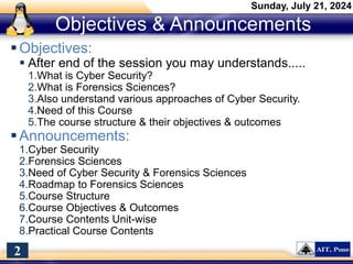 The document introduces a course on cyber security and digital forensics, outlining its objectives and course structure. It covers essential topics like cyber security definitions, types of cyber threats, and digital forensics techniques including evidence collection and analysis. Additionally, it emphasizes the importance of digital forensics in crime solving and provides insight into related career opportunities and skills required in the field.