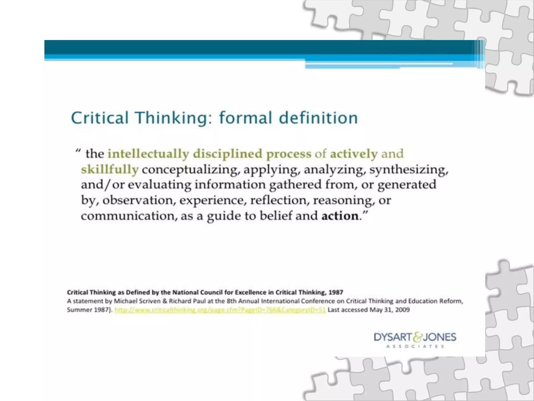 Definition of critical thinking emphasizing self-evaluation, analysis of information, and sound reasoning.