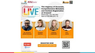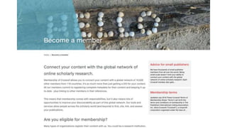 Crossref is a not-for-profit organization that simplifies scholarly research discovery through persistent identifiers (DOIs) and metadata services for over 19,000 member organizations. Members benefit by increasing the visibility of their content, participating in collaborations, and utilizing various services such as reference linking and similarity checks. The organization aims to create a comprehensive and open scholarly infrastructure that supports research outputs and facilitates global collaboration.