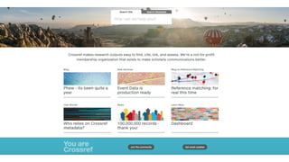 The document provides an agenda and overview for a Crossref event. The agenda includes sessions on Crossref services like metadata registration, reference linking, and metrics. Additional sections discuss Crossref's role in connecting research outputs, its membership of over 12,000 organizations, and the over 100 million scholarly works in its metadata store. Crossref metadata is used to discover content, drive traffic to publications, link references, and understand impact. The organization aims to make scholarly communication better through open metadata services.