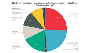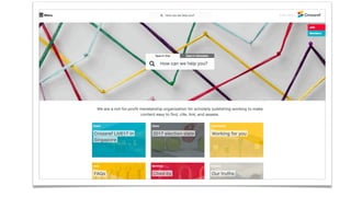 The document outlines a schedule for a Crossref overview event that includes sessions on content registration, metadata importance, and the benefits of Crossref services for libraries and researchers. It highlights Crossref as a not-for-profit organization that supports scholarly communications through metadata management and various technical services, with governance by an elected board. Additionally, it mentions the role of Crossref members and provides statistics on the types and amounts of scholarly content registered.