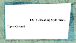 This document discusses cascading style sheets (CSS) and provides examples of using different CSS selectors and properties. It covers: