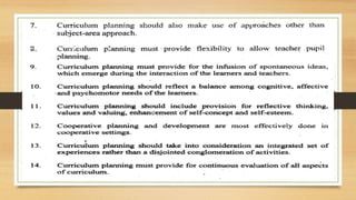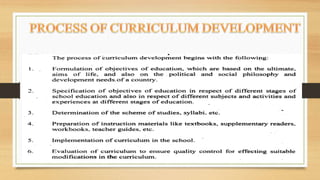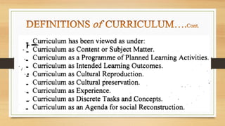 The document discusses definitions and concepts related to curriculum. It provides 10 definitions of curriculum from different education experts that focus on curriculum as the totality of a student's activities and experiences, a means to achieve educational goals, and the sum of what is taught in schools. It then lists 11 characteristics of curriculum, such as it being a totality of activities, a means to an end, reflecting educational trends, and helping achieve goals. The document explores these concepts in more depth.