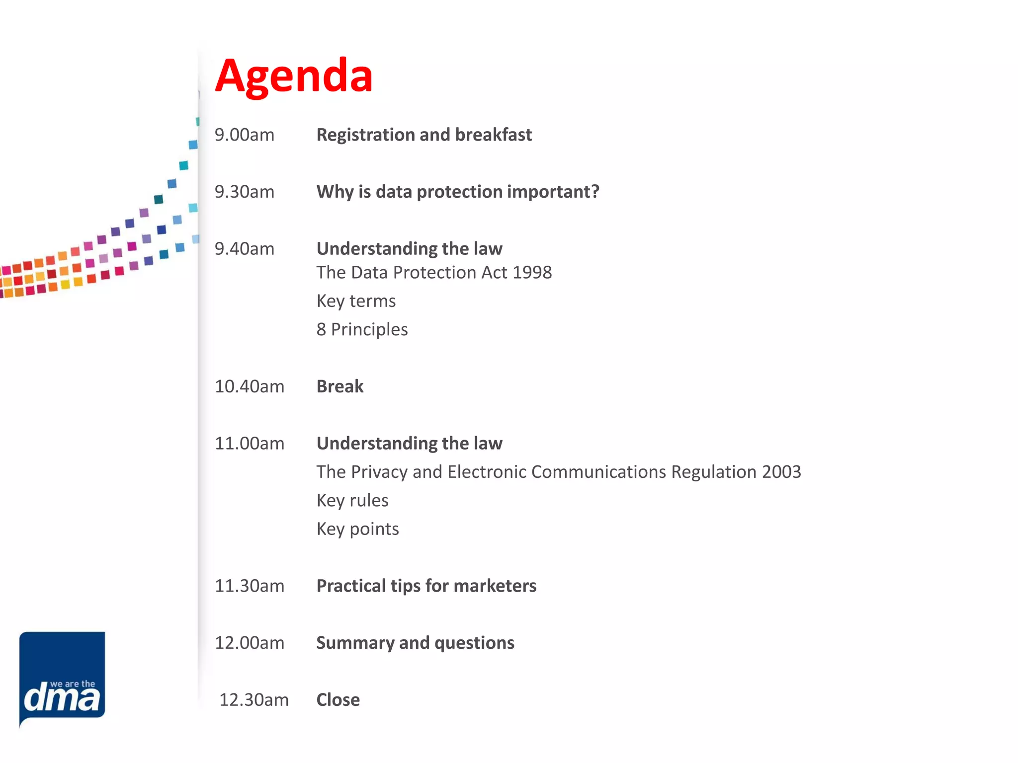The document provides an agenda and overview for a data protection training session. The agenda covers why data protection is important, key terms and principles of the Data Protection Act 1998 and Privacy and Electronic Communications Regulation 2003, and practical tips for marketers. It discusses important data protection concepts like personal data, consent, data controllers, the 8 data protection principles, and rules around electronic communications. Practical tips include ensuring proper data capture, maintaining accurate marketing permissions, conducting due diligence on sourced data, and strategies for regaining lost permissions.