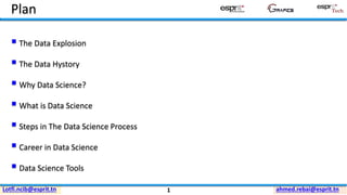 This document provides an introduction to data science. It discusses the rapid growth of data and defines data science as extracting insights from vast amounts of data using scientific methods. The document outlines the typical steps in the data science process: acquire, prepare, analyze, report and act on data. It also discusses career opportunities in data science and common tools used, including programming languages, mathematics/statistics foundations and visualization/modeling tools.