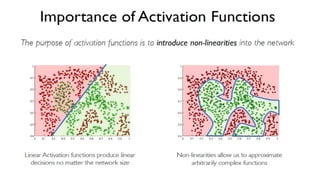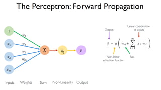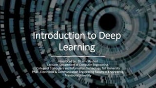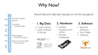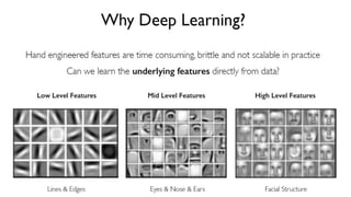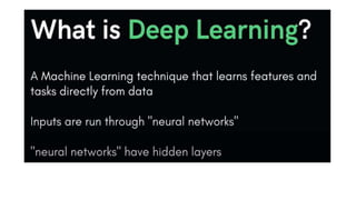 Deep learning is introduced along with its applications and key players in the field. The document discusses the problem space of inputs and outputs for deep learning systems. It describes what deep learning is, providing definitions and explaining the rise of neural networks. Key deep learning architectures like convolutional neural networks are overviewed along with a brief history and motivations for deep learning.