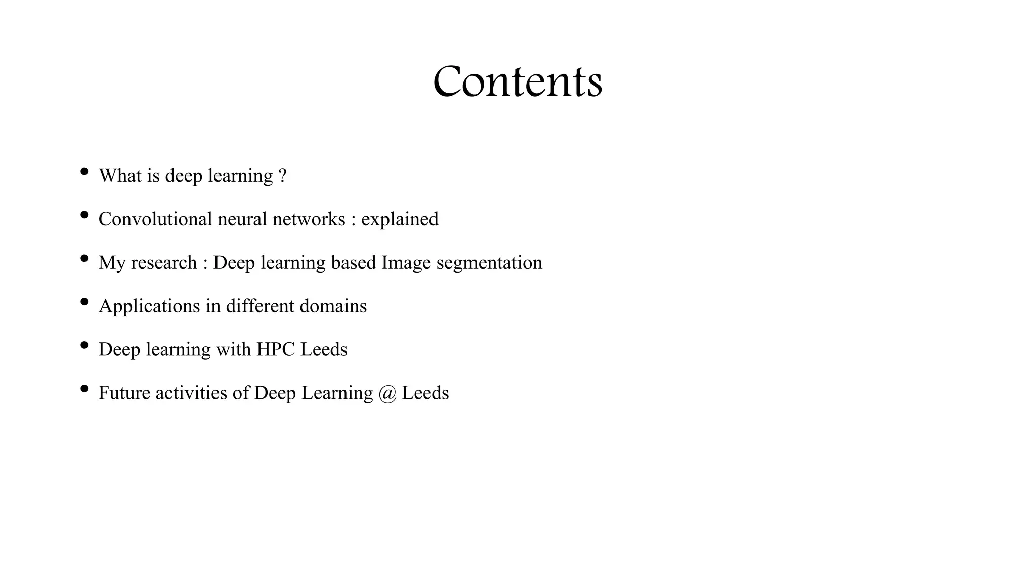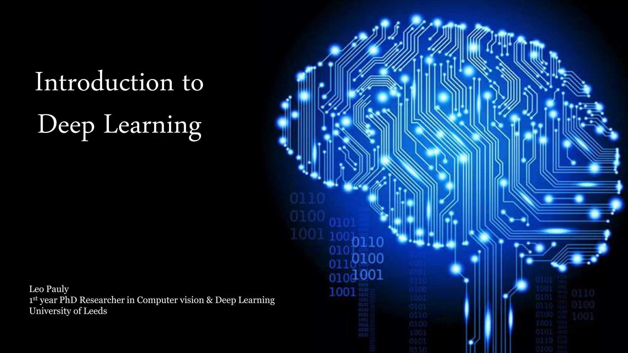 The document provides an introduction to deep learning, covering its history, key concepts like convolutional neural networks, and research focuses in image segmentation. It discusses various applications of deep learning across fields such as computer vision, natural language processing, and robotics, as well as current activities at the University of Leeds. The text emphasizes the evolution of deep learning, addressing challenges and advancements including containerization for high-performance computing.