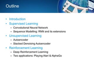 This document provides a comprehensive introduction to deep learning, covering key concepts such as supervised learning with convolutional neural networks (CNNs) and recurrent neural networks (RNNs), as well as unsupervised and reinforcement learning methods. It highlights the hierarchical representation learning process, the architecture of RNNs including LSTMs to address vanishing gradient issues, and applications of these models in tasks like machine translation and visual question answering. Additionally, it discusses deep reinforcement learning techniques exemplified by applications like AlphaGo and Atari games.