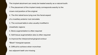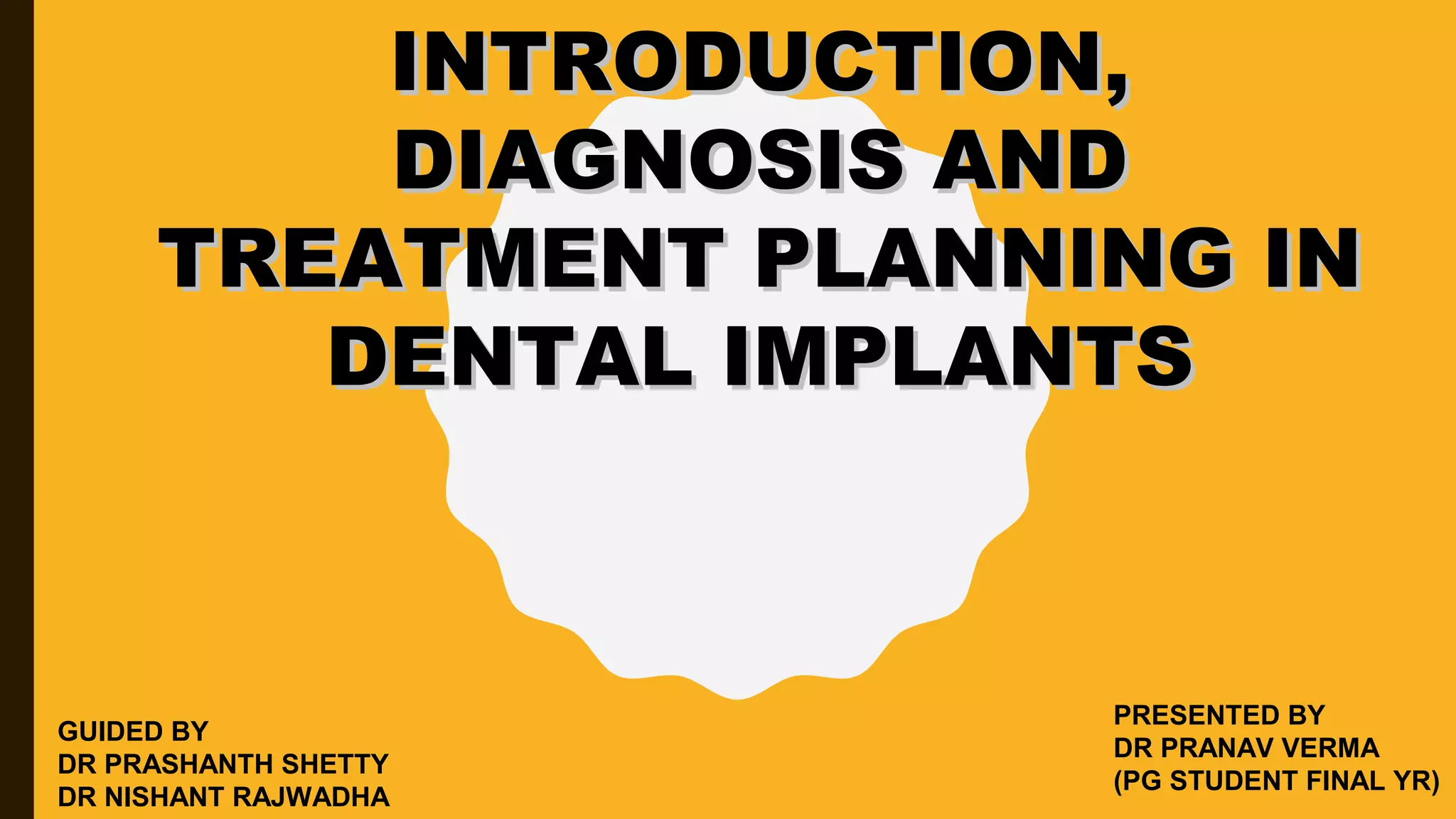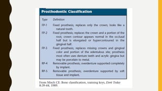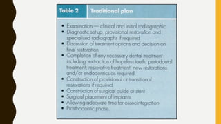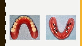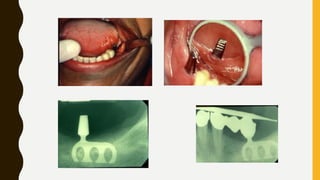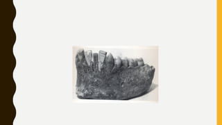 This document provides an overview of the history and evolution of dental implants from ancient times to the modern era. It discusses early attempts at implant dentistry dating back thousands of years, including the use of animal teeth, carved ivory, and other materials as implants. The document then outlines several key periods in the more recent history and development of dental implants, including pioneers who advanced implant techniques and materials in the 18th century through the early 20th century. It focuses on the foundational work done in the late 1930s and 1940s that marked the beginning of modern implant dentistry.