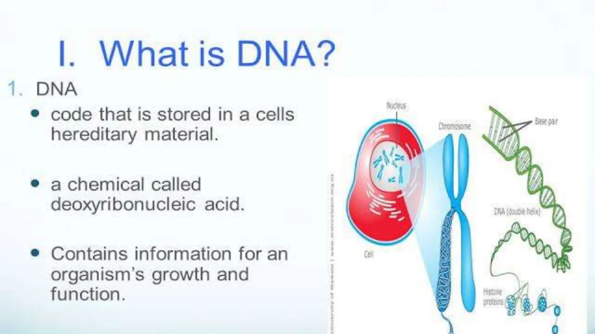 The document explores the relationship between DNA, genes, and chromosomes for an 8th-grade audience. It outlines key concepts such as inheritance, the structure of genes, and the location of chromosomes within a cell, and includes assessment questions to gauge understanding. The presentation aims to clarify how DNA replication works and the significance of genetic information.