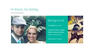 The document presents an introduction to UX design by Ashley Crutcher, outlining key concepts, tools, and strategies related to user experience and interface design. It includes insights on user flows, content strategy, wireframing, prototyping, and resources for further learning. Additionally, there are mentions of upcoming events for UX professionals to engage in community-driven projects.