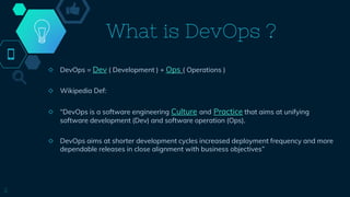 DevOps is a culture and practice that integrates software development and operations, aiming for shorter development cycles and more reliable releases. It emerged from the agile software development movement and emphasizes collaboration, automation, and efficient management of the software lifecycle. The document outlines key DevOps practices, including build automation, continuous integration, and monitoring, which facilitate faster, safer deployments and foster cooperation between development and operations teams.