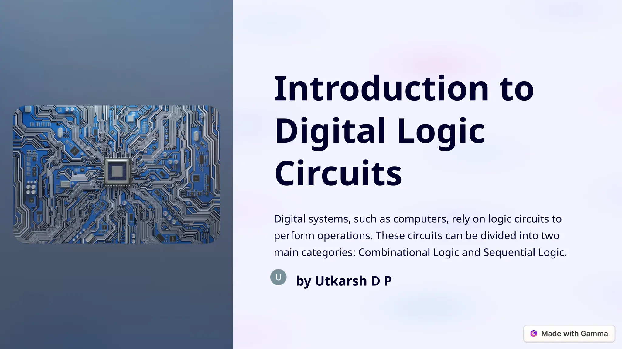 The document provides an introduction to digital logic circuits, which are essential for digital systems like computers. It explains the distinctions between combinational logic, which outputs results based solely on current inputs, and sequential logic, which incorporates memory elements to account for past inputs. Key examples include adders and counters, highlighting their applications in arithmetic operations and data management.