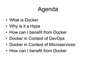 This document introduces Docker and discusses its benefits. Docker is an open platform that allows developers and administrators to build, ship, share, and run distributed applications. It allows building applications from any programming language or framework. Docker provides portability, automation, standardization, and the ability to rapidly scale applications up or down. It also helps support microservices architectures.