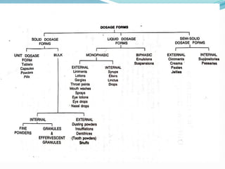 The document provides an overview of dosage forms used in pharmaceuticals, defining dosage forms as the physical forms of drugs for administration, including solid, semi-solid, and liquid categories. It highlights the importance of dosage forms in ensuring safe and accurate drug delivery, protecting the drug, and optimizing therapeutic effects. Various types of dosage forms are described, including tablets, powders, creams, and solutions, along with their ideal properties and classifications.