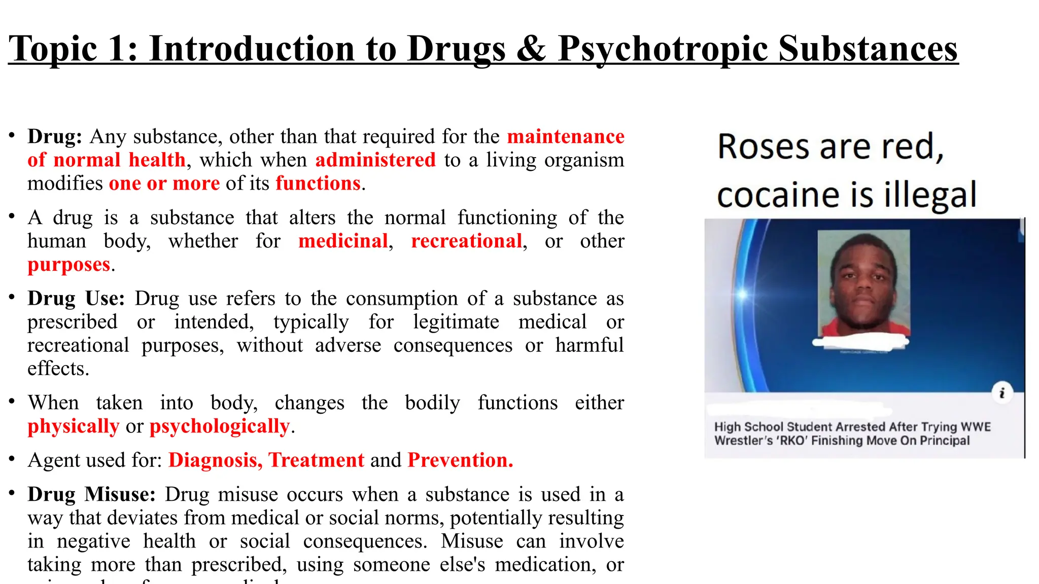 The document provides an overview of drug use, abuse, and addiction, defining key terms such as drug misuse, habituation, and dependence. It discusses the physiological and psychological consequences of drug use, including various classifications of drugs and their effects on the central nervous system. Additionally, it highlights the need for increased understanding of drug misuse within cultural contexts, and outlines the potential harms associated with different types of substances.