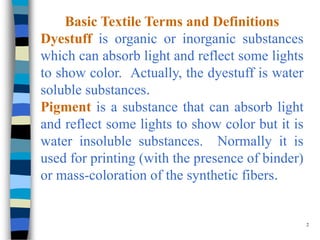 The document provides an introduction to textile dyeing, including definitions of basic terms like dyestuff and pigment, an overview of dyeing processes and factors that influence dye choices, and descriptions of different types of dyes including direct dyes for cellulosic fibers, reactive dyes, vat dyes, sulfur dyes, and disperse dyes for synthetic fibers. Classification methods for dyes and dyeing conditions for various fiber and dye combinations are also outlined.