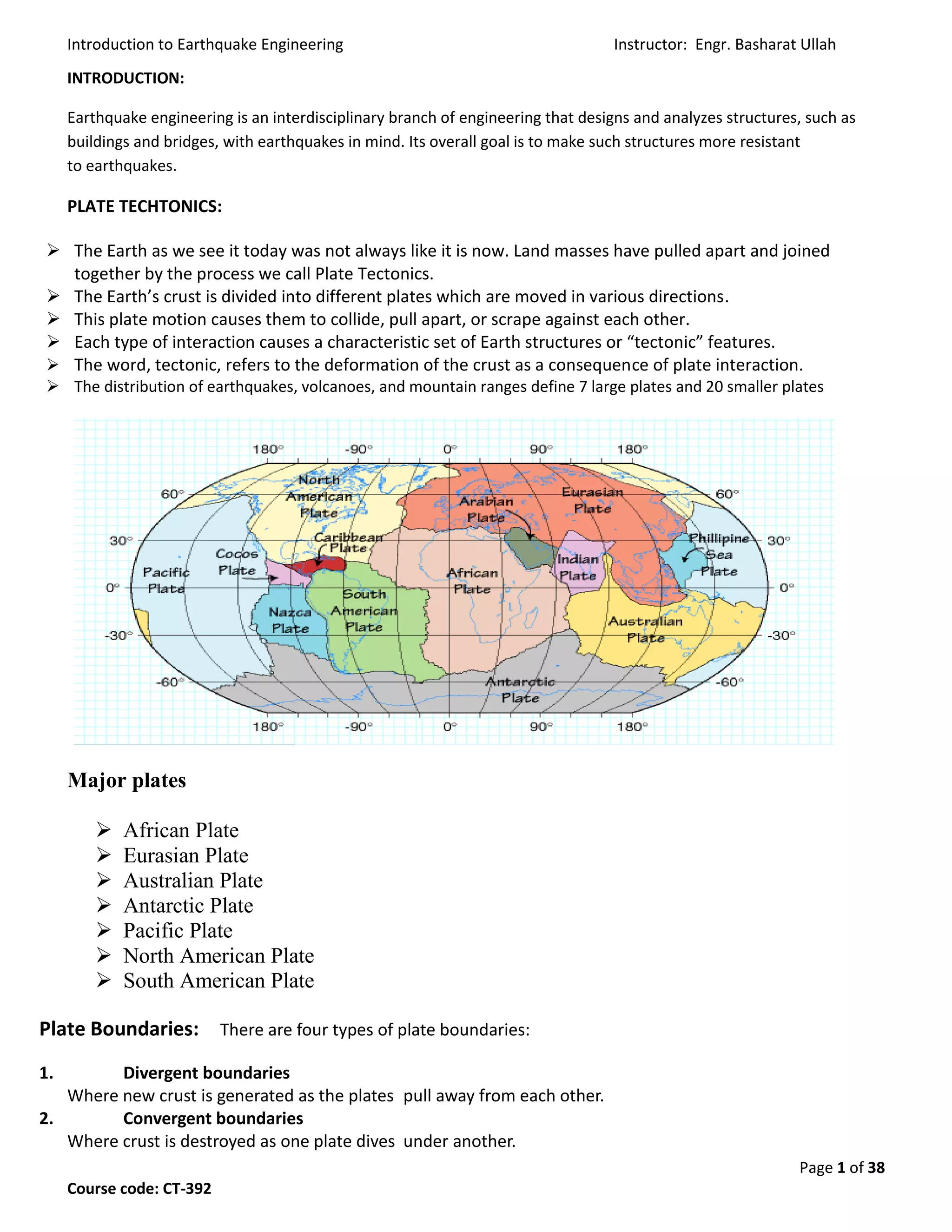 This document provides an introduction to earthquake engineering. It discusses key topics such as plate tectonics, the elastic rebound theory of earthquakes, seismic waves, earthquake magnitude and intensity scales, factors affecting seismic forces, and response spectra. The overall goal of earthquake engineering is to design structures to better resist earthquakes by understanding earthquake mechanisms and their effects on buildings.
