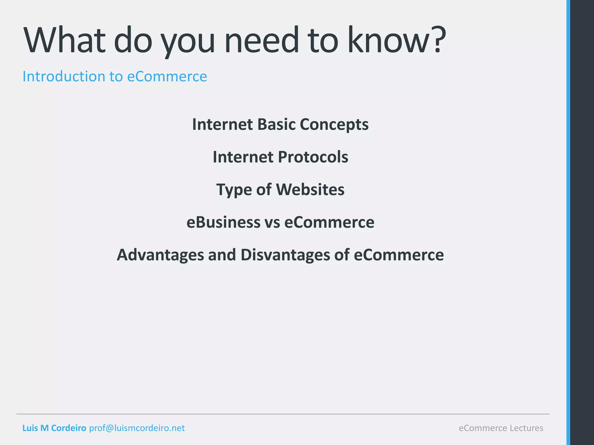 This document contains an introduction to eCommerce presented by Luis M Cordeiro. It discusses key concepts like internet basics, protocols, types of websites, advantages and disadvantages of eCommerce. It also provides a history of eCommerce dating back to the 1970s and definitions of eCommerce and eBusiness. The presentation covers advantages for sellers, consumers and society and concludes with a discussion section and contact details for Luis M Cordeiro.