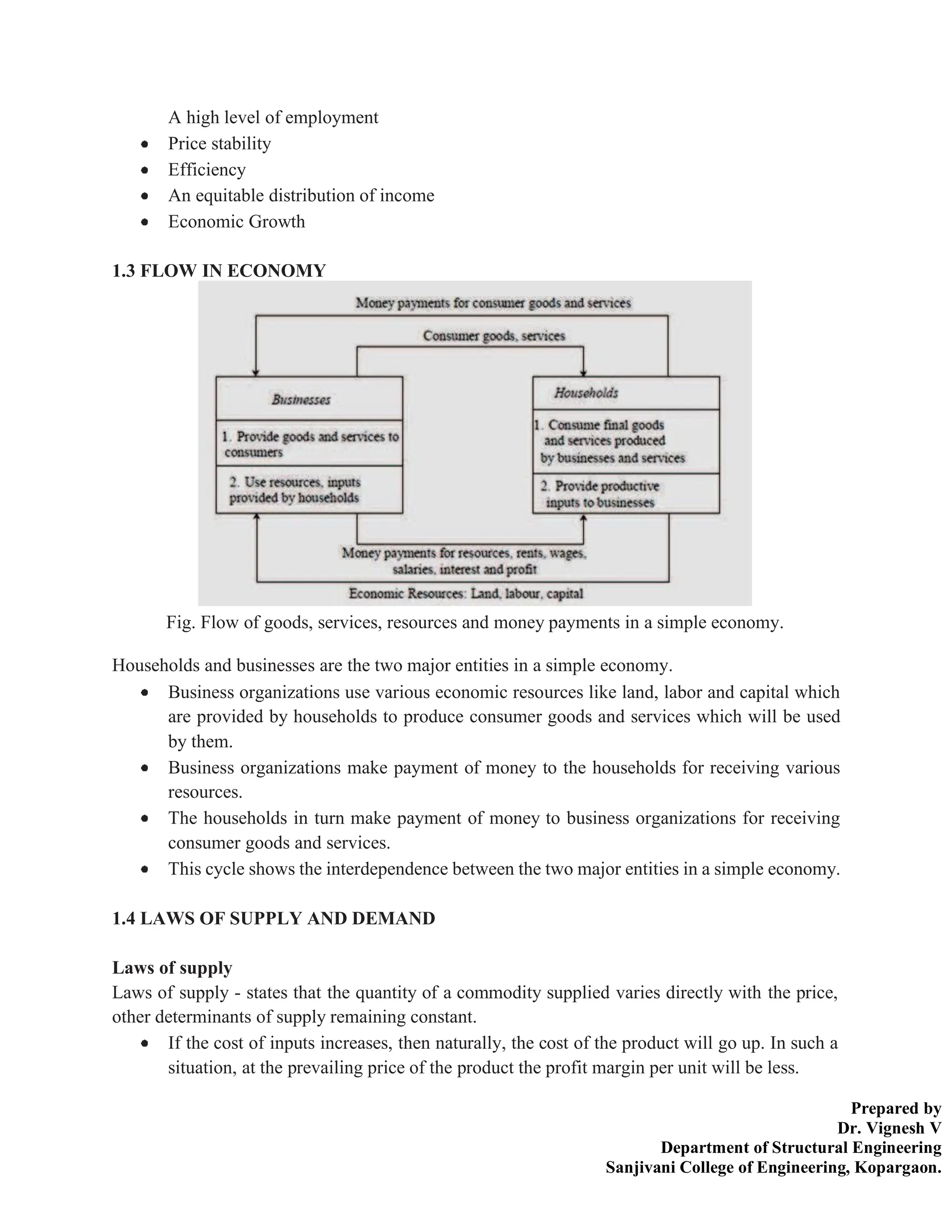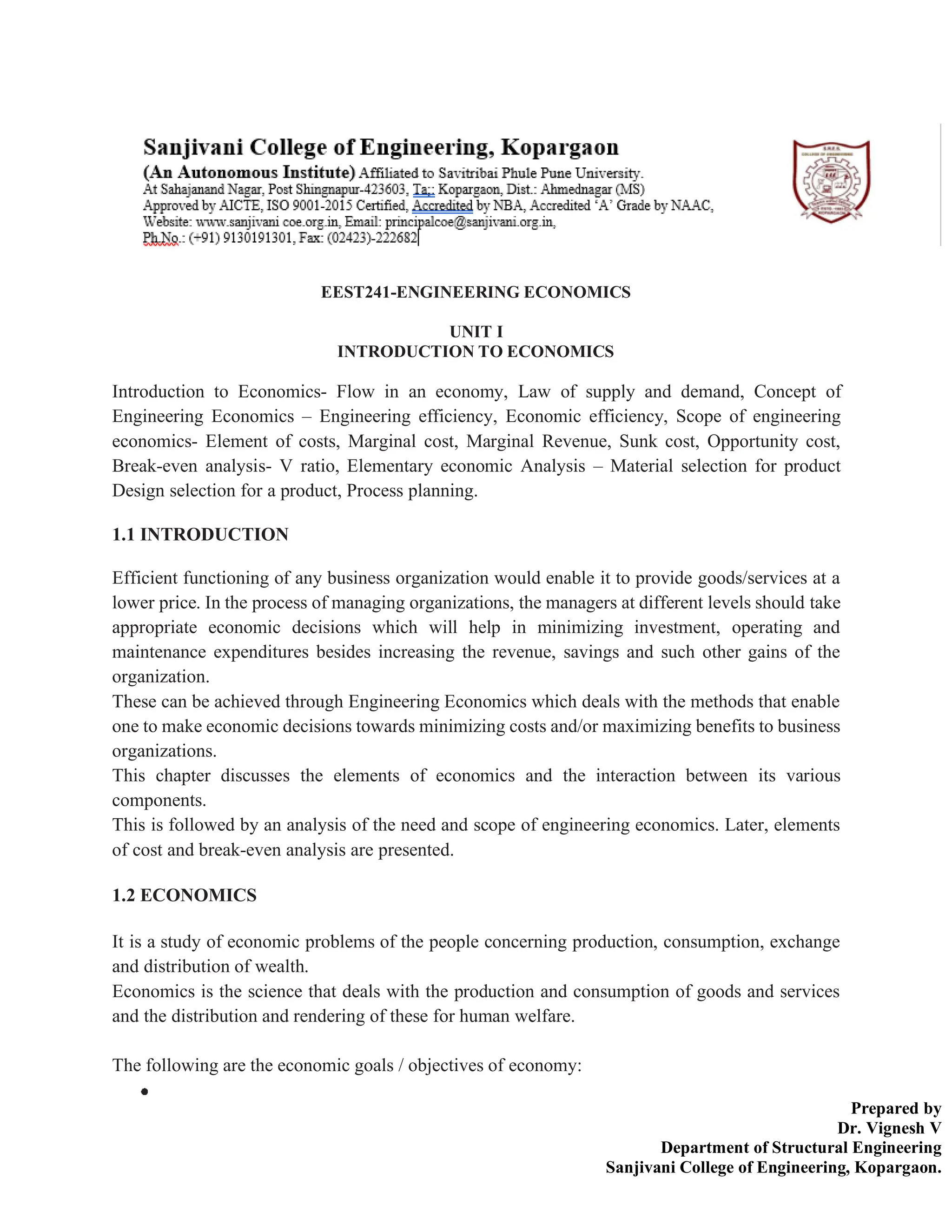 The document provides an overview of engineering economics and its relevance to business organizations, detailing the flow of an economy, laws of supply and demand, and the concept of economic efficiency. It discusses various economic components such as costs, break-even analysis, and decision-making methods aimed at minimizing costs and maximizing benefits. Key elements surrounding production costs, including direct and indirect costs, are examined to illustrate their impact on pricing and overall economic efficiency.