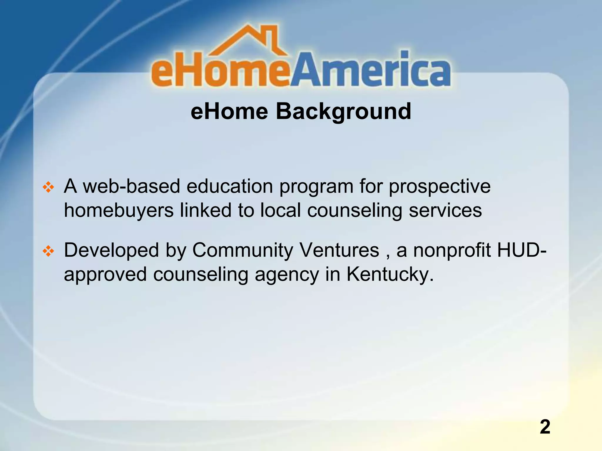 eHome is a web-based education program for prospective homebuyers, developed by a nonprofit agency, which has partnered with over 375 organizations nationwide and completed over 100,000 registrations since 2009. The program aims to increase the market share of first-time homebuyers who receive education and counseling by providing convenient, 24/7 access to resources at a lower cost. Revenue sharing models ensure sustainability for local counseling agencies and further enhance the accessibility of homeownership education.