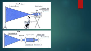 1. Transmission electron microscopes use electrons instead of light to image samples, allowing for much higher resolution down to the nanometer scale.