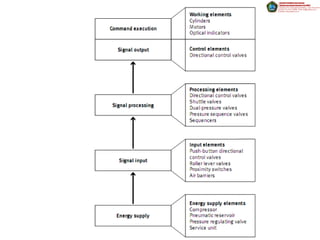 Electropneumatic systems combine pneumatic actuators and controllers with electric control circuits. Pneumatic actuators include cylinders, motors, and valves, which are powered by compressed air. However, the electric control circuits use electrical components like switches, relays, and programmable logic controllers to control the flow of compressed air and automate pneumatic processes. While pneumatic systems can be complicated to control, electropneumatic systems simplify control with digital electric signals regulating complex pneumatic circuits and multiple actuators.