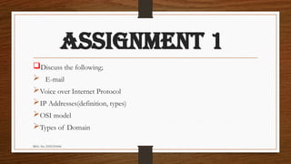 The document covers various topics related to internet communication technologies including email, VoIP, IP addresses, and the OSI model. It details the creation and components of email, workings and advantages of VoIP, types and importance of IP addresses, and outlines the structure of the OSI model. Additionally, it discusses the significance of domain names and their management in relation to internet presence.