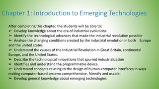 This document provides an introduction to emerging technologies and data science. It begins with an overview of emerging technologies, including definitions of emerging technology and technological evolution. It then discusses the four industrial revolutions in detail. The document also covers data science concepts such as the roles of data scientists and different data types from various perspectives. It defines structured, semi-structured, and unstructured data.